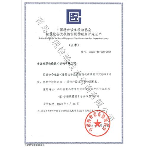 特種設(shè)備無損檢測機構(gòu)級別評定證書